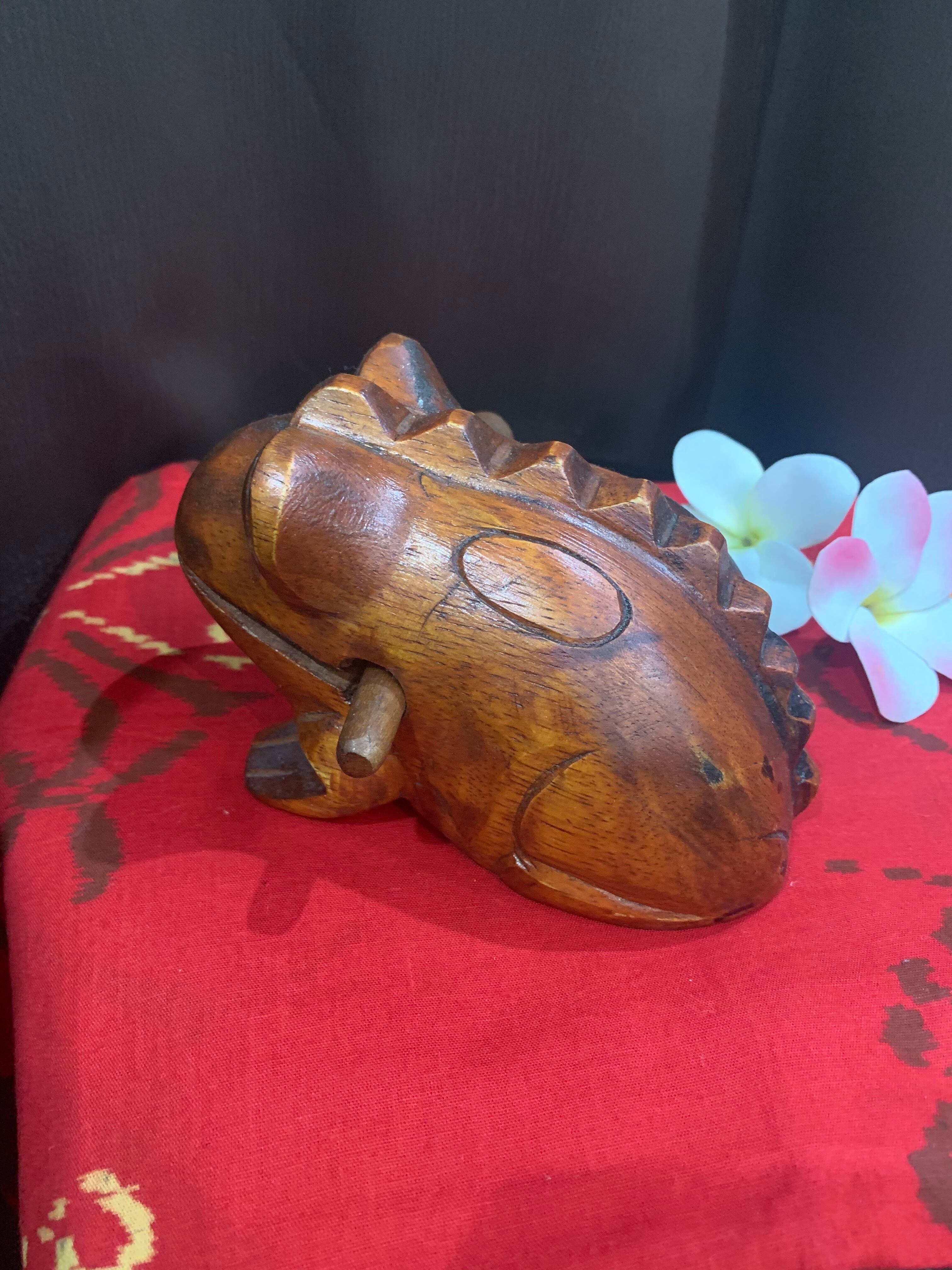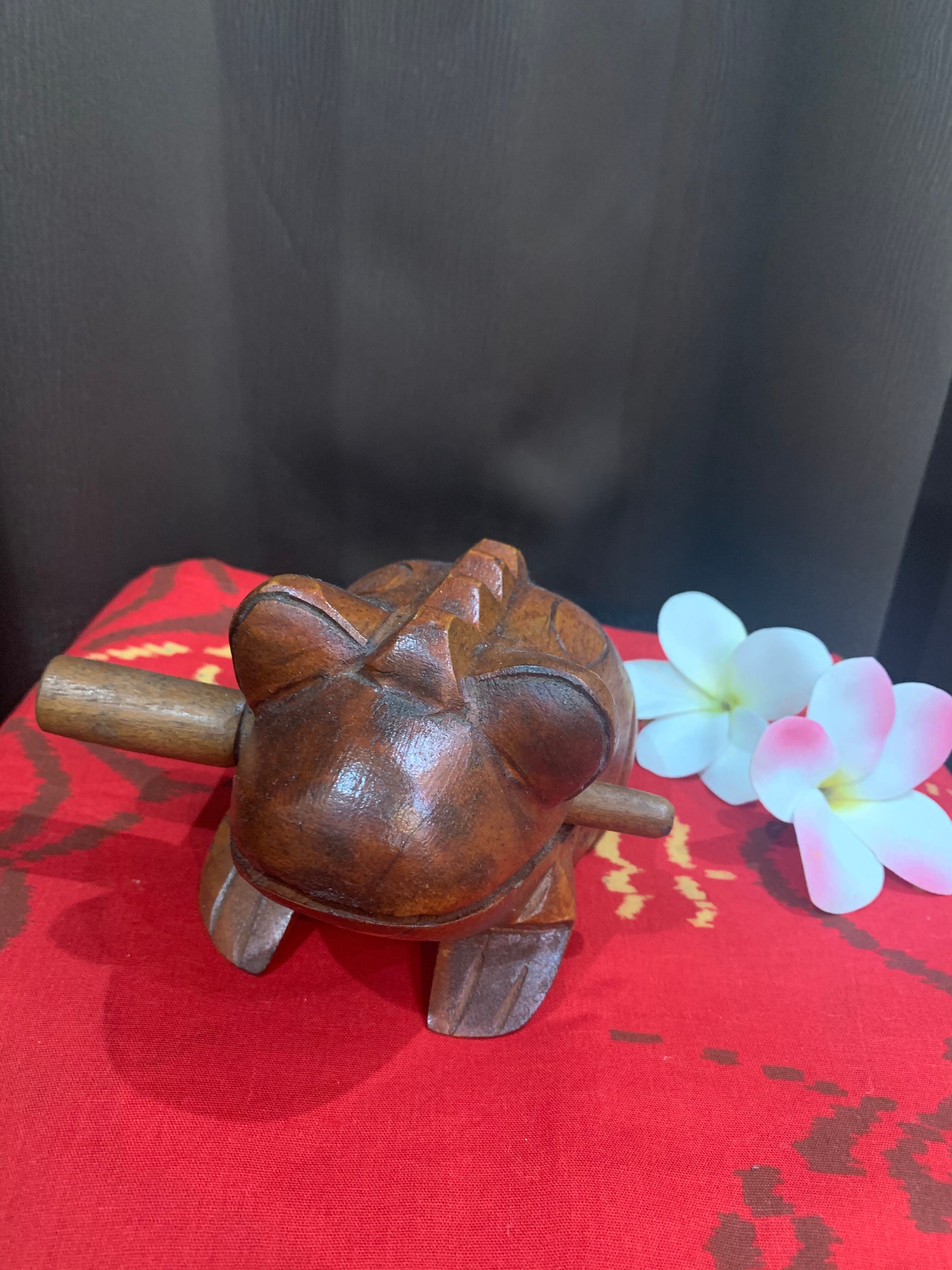 口に挟んでいる棒の太い方で、カエルの背中を縦方向に上下すると「ゲコゲコ」鳴ります。